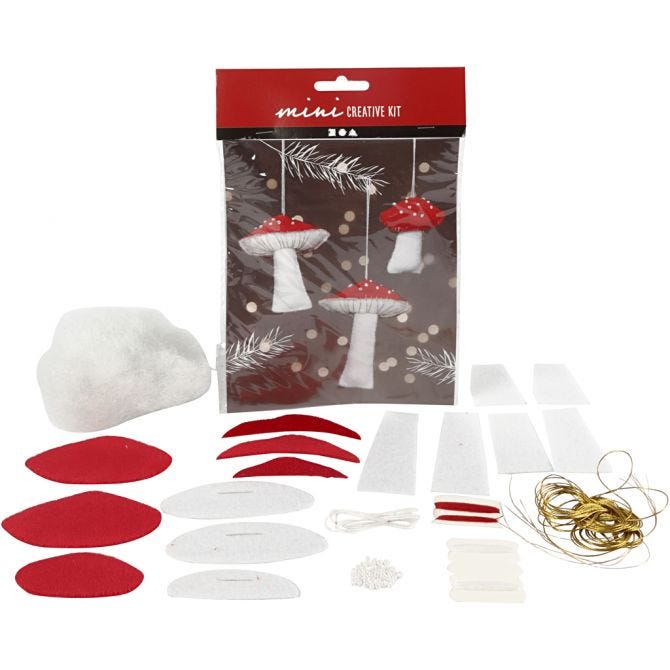 Inhoud: voorgeknipt rood velours en wit vilt, witte rocailles, polyester vulling en draad. Instructies inbegrepen. De grootte geeft de afmetingen van het eindproduct aan.